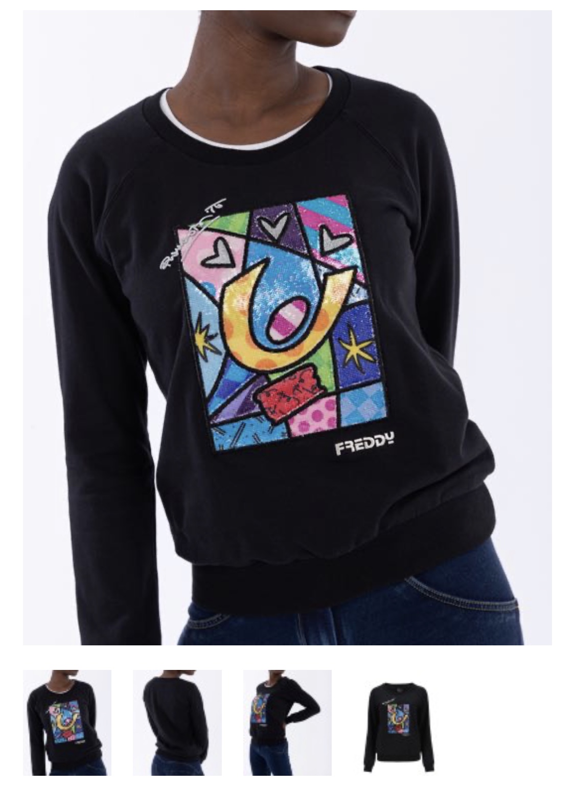 袖口と裾にリブ編みをあしらったレギュラーフィットのこのウェアは、刺繍とスパンコールで彩られた、FREDDYのためにデザインされた様々な素材のパッチを通してアーティストのビジョンを表現したRomero Britto Collectionのコレクションです。
