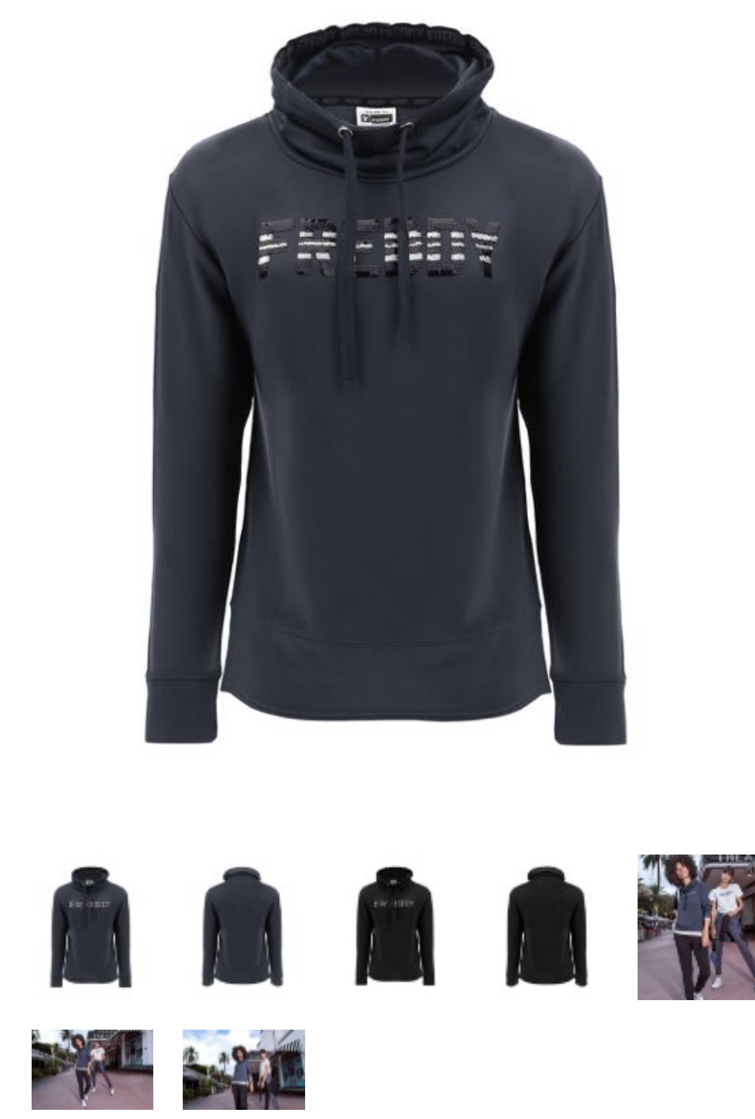 ツートンカラーのスパンコールFREDDYロゴ、ドローストリングとフロントデコレーションで調整されたハイリングカラーのレギュラーフィットのトレーナー。袖口はリブ付き、裾はややフレア仕様。