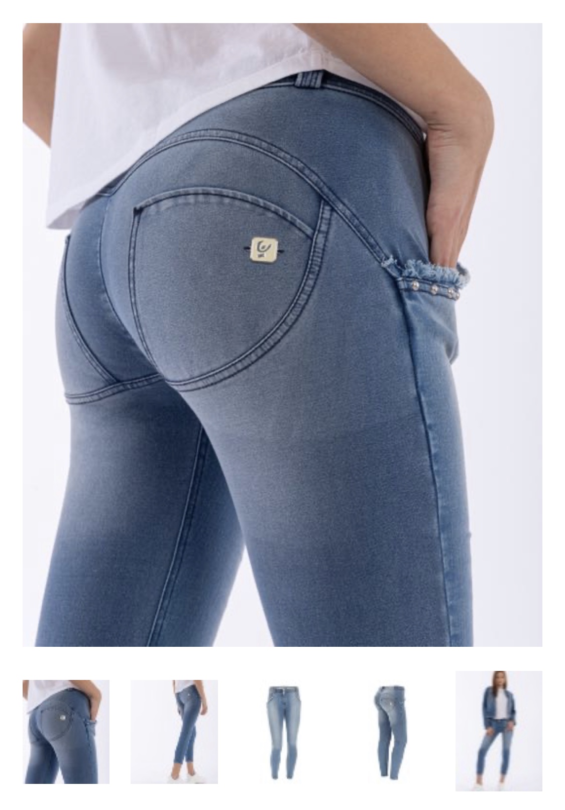 これらのジェギンスは通常のウエストで、脚の長さは7/8です。 裾とポケットの縁に沿ったフリンジとスタッドがジーンズの良さにエレガントさをプラス、ワンランク上のスタイルを完成させます。 常に存在するジーンズの魅力と、女性らしさの輪郭を際立たせる独自のWR.UP®テクノロジーのシェイピング効果を組み合わせたパンツです。